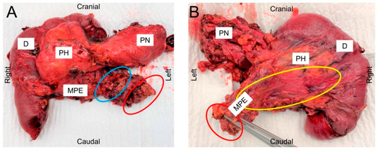 All resections were performed by trained hepatobiliary surgeons of our department. In summary, the aim of the procedure is a complete dissection of perineural and lymphatic tissue including the fat surrounding the pancreatic head/uncinate process (CHA, GDA, CT, SMA, PV, SMV) in an “en-bloc” resection (Figure 3A,B).