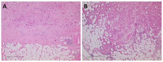 In all 27 patients, paraffin-embedded histopathologic specimens were available for retrospective re-evaluation of the mesopancreatic fat tissue of the peripancreatic dorsal resection margin (Figure 4A,B). Tumor infiltration of adipose tissue was evident in 17 patients (62.9%), whereas in only 10 patients (37.1%), mesopancreatic adipose tissue had no tumor infiltration (Table 2). In all 17 patients with mesopancreatic fat infiltration, vital tumor cells were present.