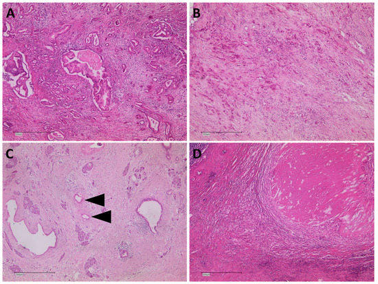 The CRM evaluation was implemented at the University Hospital of Duesseldorf in September 2015. The oral/aboral duodenal, bile duct and pancreatic neck resection margin, as well as the dorsal resection margin and, if applicable, portal vein specimen were examined according to the LEEPPs pathological protocol. Additionally, the mesopancreatic adipose tissue was histopathologically evaluated for cancerous infiltration (Figure 4A,B). Cases evaluated before 2015 were re-visited by an experienced pancreaticobiliary pathologist and, if sufficient slides were available, a CRM status including evaluation of the mesopancreatic fat was designated. This included the evaluation not only of the dorsal, but also ventral and medial CRM. In addition, the “1-mm rule” was implemented: a minimum margin clearance of 1 mm defined R0CRM−, whereas margin clearances between 0 and 1 mm were judged as R0(CRM+) [33]. Tumor response following neoadjuvant treatment was graded according to the College of American Pathologists (CAP) (grade 0 = complete response, grade 1 = near complete response, grade 2 = partial response and grade 3 = poor/no response) (Figure 5A–D) [34].
