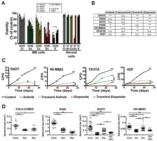 Antiangiogenic compounds strongly impair the viability and proliferation of MB cells. (A) Viability of the indicated cell lines treated for 48 h with axitinib (5 µM, Ax, green), cabozantinib (5 µM, Cz, yellow), sunitinib (5 µM, Su, red) or etoposide (1 µM, E, black). All the compounds were dissolved in DMSO, the amount of which was adjusted to be the same in every condition. Control conditions (Ct, white) were also treated with the same amount of DMSO. Histograms represent the means ± SEM; each independent datapoint is represented (white circles) (n.d.: not determined). (B) Table showing the statistical significance of the viability results for each compound compared to the control condition (*** p < 0.001, ** p < 0.01, n.s.: nonsignificant, Student’s t-test comparing at least three independent experiments). (C) Cumulative population doubling (CPD) of the indicated MB and normal cell lines continuously treated with 5 µM axitinib (continuous green lines), 1 µM etoposide (continuous red lines) or transiently treated for 48 h with the same compound concentrations (dotted lines) (datapoints represent the means ± SEM of a representative experiment; *** p < 0.001, ** p < 0.01, * p < 0.05, one-way ANOVA test, the results are statistically nonsignificant unless otherwise stated). (D) Dot plots showing the endpoint size measurements of the spheroids generated with the indicated MB cell lines and continuously treated with 5 µM axitinib (Axi.), 1 µM etoposide (Eto) (CHLA-01MED and D458) or a combination of axitinib (5 µM) and etoposide (1 µM; Axi. + Eto.). The controls were all treated with a concentration of DMSO corresponding to the one used as a vehicle for the drugs (data collected from at least three independent experiments are presented; the bars represent the means ± SEM; *** p < 0.001, ** p < 0.01, * p < 0.05, one-way ANOVA test, the results are statistically nonsignificant unless otherwise stated).