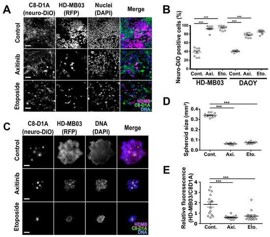 To assess the relative selectivity of the treatments towards normal and tumor cells in a single assay, we set up cocultures of fluorescently labelled HD-MB03, DAOY and C8-D1A cells (Figure 2). MB cells stably expressing RFP and C8-D1A astrocytes stained with a neuro-DiO probe were mixed and treated with axitinib or etoposide. Both treatments resulted in a 40–60% enrichment of the proportion of astrocytes relative to the total number of cells (Figure 2A,B). We performed the same experiment in 3D mixed cultures of C8-D1A astrocytes and HD-MB03 cancer cells (Figure 2C–E). Both treatments resulted in a strong decrease in the size of spheroids and a decrease in the relative fluorescence of MB vs. normal cells (Figure 2D,E). These results confirm that axitinib and etoposide selectively impair tumor cell survival.