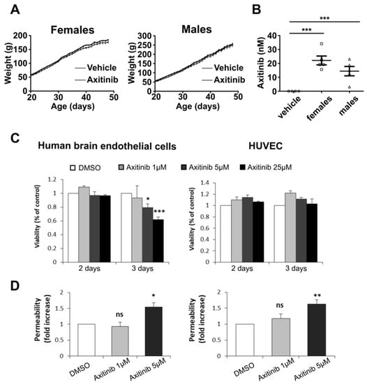 Two concerns regarding the use of a new compound to treat pediatric brain tumors are as follows: (1) the toxicity of the compound towards developing organisms and (2) its ability to cross the blood–brain barrier (BBB). Twenty-day-old weaned rats were treated daily with 50 mg/kg axitinib administered by oral gavage for four weeks. Although no direct correlation can be established between rat and human age, this early stage has been proposed to be comparable with a period of around one year of age for humans [35]. Axitinib had no effect on the general behavior and growth rate of both female and male animals (Figure 3A). At the end of the experiment, the animals were sacrificed and the axitinib content of their cerebella was measured by means of liquid chromatography coupled to mass spectrometry (LC/MS). Importantly, we showed that axitinib was present in the cerebellum (Figure 3B). Although a previous report showed that axitinib was flushed out of the brain very efficiently by ABCG2 and ABCB1/2 efflux pumps after acute exposure [36,37], there were no data previously available in the literature regarding the effect of a chronic treatment on brain axitinib accumulation. Thus, to get further insight into the mechanism leading to brain axitinib accumulation, we hypothesized that BBB permeabilization may be a result of long-term treatment with axitinib. To test this hypothesis, we used an in vitro model of BBB [29]. We first determined the toxicity of three doses of axitinib (1, 5 and 25 µM) on human brain and umbilical vein endothelial cells (hereinafter abbreviated as BEC and HUVEC, respectively) (Figure 3C). Axitinib only displayed toxicity in brain endothelial cells after three days at doses higher than 1 µM. We therefore chose the doses of 0.5, 1 and 5 µM and a 3-day-long treatment to test the effect of axitinib on the permeability of our in vitro BBB model (Figure 3D). We showed that axitinib permeabilized the barrier formed by BEC or HUVEC at nontoxic doses. These results support the idea that axitinib induces permeabilization of the BBB, allowing it to accumulate in the brain.