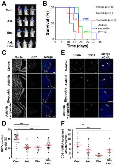 We next performed tumor xenograft experiments to address the efficiency of axitinib in MB. Importantly, receptors and kinases targeted by axitinib are expressed in human MB tumors (Supplementary Figure S4). We used cell lines that express high levels of VEGF to generate tumors (Supplementary Figure S5). HD-MB03 spheroids were implanted in the mouse cerebella and intracranial tumor engraftment and growth were monitored by means of BLI (Figure 4 and Figure S6). Tumors were considered engrafted when two consecutive increases in luciferase activity were measured. At that point the animals were randomized, and the treatments started (Supplementary Figure S7). The treatments consisted in either metronomic administration of high doses of axitinib or high doses of etoposide (50 mg/kg and 30 mg/kg, respectively, administered orally five times a week) [38,39]. To test the possibility of compensating etoposide dose reduction with axitinib in a future clinical trial, we treated the animals with a combination of half the doses of axitinib and etoposide (25 mg/kg and 15 mg/kg, respectively, administered orally five times a week). Both metronomic axitinib and combined axitinib/etoposide treatments increased survival of the animals and reduced tumor growth while metronomic etoposide treatment had no significant effect on survival (Figure 4A,B and Supplementary Figure S8). The efficiency of the axitinib/etoposide combination was confirmed in an independent experiment (Supplementary Figure S6). Histological analysis of the tumors revealed that all the treatments decreased the number of proliferative Ki67-positive cells (Figure 4C,D). Metronomic axitinib, etoposide and axitinib/etoposide treatments also decreased the number of endothelial cell (CD31-positive) and pericyte (αSMA-positive) double-stained structures representative of vessels covered with pericytes (Figure 4E,F). These results suggest that all the treatments administered in a metronomic schedule directly impact the proliferation of cancer cells and neoangiogenesis of intracranial tumors. However, axitinib and axitinib/etoposide combination only increased the mouse survival (Figure 4 and Figure S6). Hence, our results suggest that metronomic administration of axitinib alone or a combination of lower doses of etoposide and axitinib directly impacted proliferation of cancer cells and neoangiogenesis of intracranial tumors. These results also suggest that the treatments can cross the blood–brain barrier (BBB).