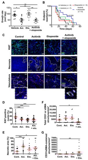 Axitinib and axitinib/etoposide combination treatments reduce subcutaneous HD-MB03 tumor growth and cell proliferation, induce necrosis and tumoral fibrosis and impair tumor vascularization. (A) Dot plots showing the growth rate of individual subcutaneous tumors treated with the indicated compounds (horizontal lines and error bars represent the means ± SEM; ** p < 0.01, * p < 0.05, one-way ANOVA test, the results are statistically nonsignificant unless otherwise stated). (B) Curves presenting the proportion of mice reaching the endpoint volume of the tumor as a function of time after tumor implantation (black: control treatment; green: axitinib treatment; red: etoposide treatment; blue: axitinib/etoposide combined treatment; the p-value of a logrank test comparing the control and axitinib/etoposide groups is indicated; all the other comparisons were not statistically significant; all the data presented were pooled from two strictly independent experiments and the total number of animals for each group is indicated in brackets). (C–G) Histological analysis of subcutaneous HD-MB03 xenografts. (C) Representative images of the sections of tumors treated with the indicated compounds: proliferative cells revealed by Ki67 immunofluorescent staining (green) and Hoechst33342 nuclear DNA counterstaining (blue); necrosis revealed by DNA counterstaining (blue) (dotted lines delineate necrotic areas); vasculature revealed by CD31 and αSMA immunofluorescent staining (green and magenta, respectively) and Hoechst33342 nuclear DNA counterstaining (blue) (images are representative of at least four independent tumors, scale bars: 100 µm). (D) Dot plot representing the quantification of the proportion of Ki67 positive nuclei in the indicated experimental conditions. (E) Dot plot representing the quantification of the proportion of necrotic area in the indicated experimental conditions, (F) the number of CD31 and/or αSMA structures per µm² and (G) the number of functional blood vessels per mm² (bars represent the means ± SEM; *** p < 0.001, ** p < 0.01, * p < 0.05, one-way ANOVA test).