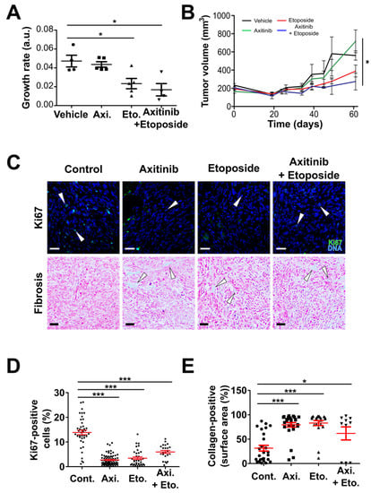 Etoposide and axitinib/etoposide combination reduce subcutaneous DAOY tumor growth and tumor cell proliferation and induce tumoral fibrosis. (A) Dot plots showing the growth rate of individual subcutaneous tumors treated with the indicated compounds (horizontal lines and errors bars represent the means ± SEM; * p < 0.05, one-way ANOVA test, the results are statistically nonsignificant unless otherwise stated). (B) Mean growth curves of subcutaneous DAOY tumors treated with the indicated compounds (errors bars represent the means ± SEM; * p < 0.05, one-way ANOVA test, the results are statistically nonsignificant unless otherwise stated). (C–E) Histological analysis of subcutaneous DAOY xenografts (* p < 0.05, Student’s t-test, the results are statistically nonsignificant unless stated otherwise). (C) Representative images of the sections of tumors treated with the indicated compounds. Proliferative cells were revealed by Ki67 immunofluorescent staining (green) and Hoechst33342 nuclear DNA counterstaining (blue) (white arrowheads: Ki67-positive nuclei). Tumoral fibrosis was revealed by Masson’s trichrome staining (nuclei: dark pink; cytoplasm: light pink; collagen: light blue; white arrowheads: collagen-positive areas; scale bars: 100 µM). (D) Dot plots representing the quantification of the proportion of Ki67-positive cells in the indicated experimental conditions and (E) the proportion of the image fields displaying consistent collagen staining (bars represent the means ± SEM; *** p < 0.001, * p < 0.05, one-way ANOVA test, the results are not statistically significant unless otherwise stated).