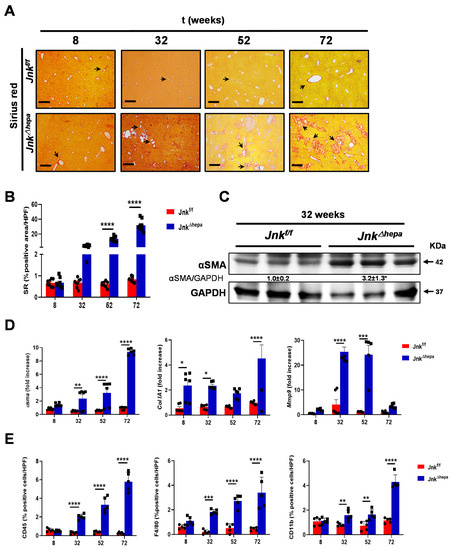 Interestingly, strong presence of fibrillar collagen networks was identified using Sirius Red (SR) staining in tissue sections from aging Jnk∆hepa mice, mimicking CS in patients [7] (Figure 1A). No signs of PKD were observed (Supplementary Figure S2A–C). The quantification of type I and III Collagen fibers in the liver parenchyma of these mice showed a clear tendency from 32 weeks of age and significant differences at 52 and 72 weeks of age, compared to Jnkf/f mice (Figure 1B). Alpha-smooth muscle actin (αSMA) protein overexpression was evident at 32 weeks of age in Jnk∆hepa mice (Figure 1C). Moreover, increased mRNA expression levels of αSma, ColIa1 and Mmp9 was observed in aging Jnk∆hepa compared with Jnkf/f livers in most of the time points assessed (Figure 1D).