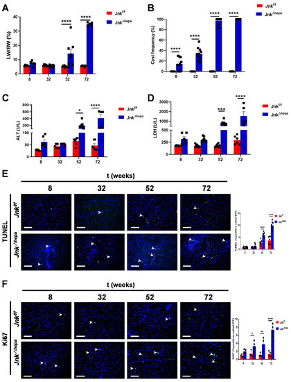 Next, we measured serum levels of surrogate markers of liver injury in aging Jnk∆hepa knockout mice. The biochemical analysis revealed that ALT and LDH levels were significantly increased in Jnk∆hepa mice from 52 weeks of age (Figure 2C,D), indicating that hepatocellular injury might be associated with cyst formation observed in Jnk∆hepa livers.