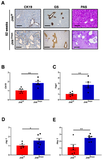 Earlier work demonstrated that hepatocellular JNK deficiency is sufficient for the stimulation of cholangiocyte proliferation and the development of malignancy, resulting in the occurrence of CCA [6]. Therefore, we next studied markers of cystic structures and cholangiocyte proliferation such as CK19 in 52-week-old Jnkf/f and Jnk∆hepa mice. Whereas CK19-positive staining was exclusive of small bile ducts in Jnkf/f mice, Jnk∆hepa livers showed increased staining in cystic areas as a result of massive cholangiocyte proliferation. This was corroborated by significantly elevated CK19 protein and mRNA expression in these livers (Figure 3A,B). Glutamine synthase (GS) is normally expressed around perivenular areas, as in Jnk∆hepa livers (Figure 3A, center panel). However, transforming cells express GS. We observed strong positive areas of GS staining are visible in Jnk∆hepa livers (Figure 3A, center panel). Concomitant with our GS results, Periodic Acid Schiff (PAS) staining, characteristic of mucin-containing tissues, was restricted to cystic areas in Jnk∆hepa livers (Figure 3A, right panel). Next, we analyzed markers of hepatoblast differentiation. Interestingly, the mRNA expression of Yap1, a marker of hepatoblast differentiation [22] and Jag1 and Hey1, genes involved in the Notch signaling pathway [23], were significantly upregulated in 52-week-old Jnk∆hepa compared with Jnkf/f mice (Figure 3C–E).