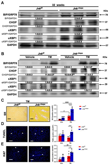 Activation of the unfolded protein response (UPR) triggers increased liver injury in Jnk∆hepa mice. (A) The expression of BiP/GRP78, CHOP, spliced XBP1 (sXBP1) and unspliced XBP1 (uXBP1) was evaluated in 32-week-old Jnkf/f and Jnk∆hepa mice using Western blot. (B) The expression of the same proteins was measured in Tunicamycin (TM)-challenged Jnkf/f and Jnk∆hepa mice. Numbers denote molecular weight (KDa) of proteins. GAPDH served as loading control. #/* p < 0.05 intra- and intergroup significance, respectively. (C) Representative Sirius Red (SR) stainings of liver tissue from the indicated mice after TM treatment. Scale bars, 500 μm. (D) TUNEL staining was performed to assess apoptotic cell death in the same samples by IF. Scale bars, 50 μm. (E) Ki67 was used to measure cell proliferation after TM treatment in the experimental groups. Scale bars, 50 μm. Data were represented as the mean ± SEM and graphed (n = 3–6 mice per group;*/# p < 0.05; ## p < 0.01; *** p < 0.001; ****/#### p < 0.0001).