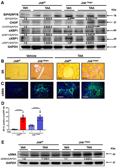 TAA challenge exacerbates liver fibrogenesis in mice with hepatocytic deletion of Jnk1/2. (A) The expression of BiP/GRP78, CHOP, spliced XBP1 (sXBP1) and unspliced XBP1 (uXBP1) was evaluated in the livers of Jnkf/f and Jnk∆hepa mice treated or not with TAA using Western blot. Numbers denote molecular weight (KDa) of proteins. GAPDH served as loading control. (B) Representative Sirius Red (SR) stainings of liver paraffin sections from control and TAA-treated Jnkf/f and Jnk∆hepa mice (n = 6-8 mice per group). Scale bars, 500 μm. (C) Expression of αSMA protein was assessed via IF staining. Scale bars, 50 μm. (D) Positive area of fibrosis was calculated by ImageJ with microphotographs of SR staining. Data were represented as the mean ± SEM and graphed. (E) Expression of αSMA was analyzed by Western blot in the indicated groups of mice. Numbers denote molecular weight (KDa) of proteins. GAPDH served as loading control. (# p < 0.05; ** p < 0.01; ***/### p < 0.001; ****/#### p < 0.0001).