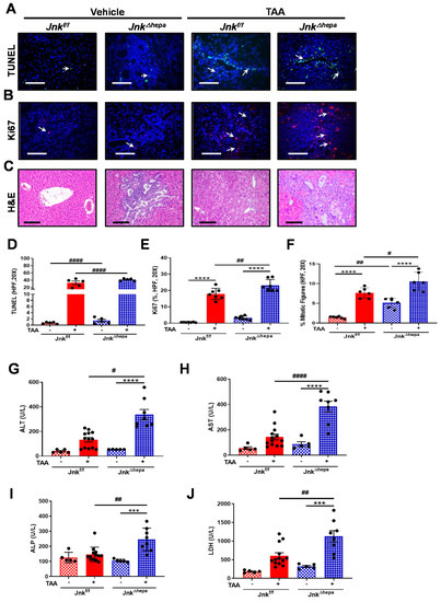 Given that TAA supplementation caused a strong induction of liver fibrosis in mice with hepatocytic deletion of Jnk1/2, we next sought to evaluate the hepatotoxic response to TAA in our experimental groups. TUNEL staining was performed to detect cell death. Microphotographs and data quantification indicated that TAA significantly induced cytotoxicity in both Jnkf/f and Jnk∆hepa animals. However, apoptotic cell death was exacerbated in Jnk∆hepa compared with Jnkf/f livers (Figure 6A,D). Concomitant analysis of cell proliferation using Ki67 indicated that compensatory cell proliferation in response to TAA-induced cell death occurred in both Jnkf/f and Jnk∆hepa animals. Nevertheless, this response was significantly elevated in Jnk∆hepa compared with Jnkf/f livers (Figure 6B,E). Moreover, the frequency of mitotic figures was significantly increased in TAA-treated Jnk∆hepa compared with Jnkf/f livers (Figure 6F).