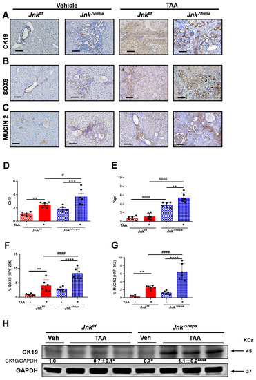 Figure 7. Markers of cholangiocarcinogenesis in JnkΔhepa mice livers upon chronic TAA challenge. (A–C) Representative IHC staining for CK19, SOX9 and MUCIN2. Scale bars, 100 μm. (D,E) mRNA expression of Yap1 and Ck19, was evaluated by qRT-PCR. Quantification of Sox9 and Mucin2 positive cells/HPF (20X) was performed in the same livers. Percentage of SOX9 (F) and MUCIN2 (G) positive cells was performed in HPF (20X) in liver paraffin sections and graphed. (H) Expression of CK19 protein was assessed via Western blot. Numbers denote the molecular weight (KDa) of proteins. GAPDH served as loading control. (n = 6; */# p < 0.05; **/## p < 0.01; *** p < 0.001; ****/#### p < 0.0001).