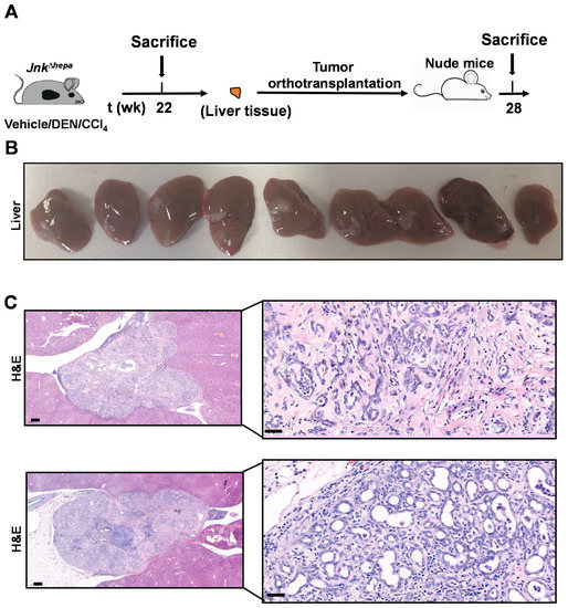 Lesions developed in DEN/CCl4 treated Jnk∆hepa mice are malignant and display CCA histological features. (A) Lesions developed in DEN/CCl4 treated Jnk∆hepa mice were excised and orthotopically implanted in nude mice (n = 9), which were sacrificed and analyzed 28 weeks later. (B) Macroscopic aspect of livers from recipient mice after orthotopic implantation of lesions from DEN/CCl4 treated Jnk∆hepa animals. (C) H&E stainings of representative tissue sections of orthoallografts growing in the livers of recipient animals. Scale bars, 50 (left panels) and 200 (right panels) µm, respectively.