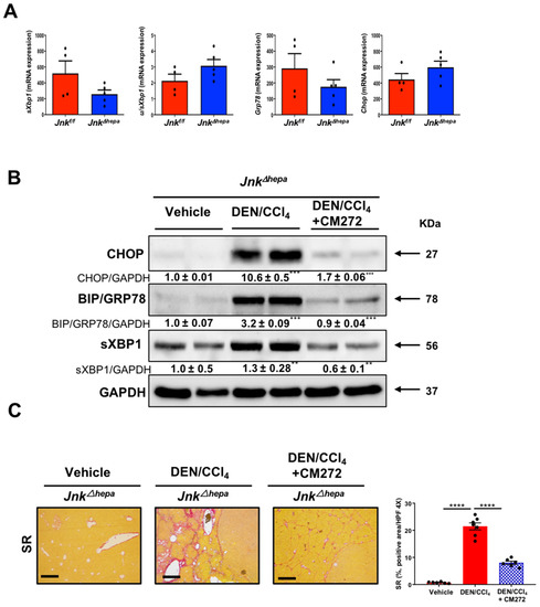 3.8. Hepatotoxin-Challenged Jnk∆hepa Mice Develop Fibrocystic Liver Disease and CCA in Association with a Strong UPR Activation: Therapeutic Potential of an Innovative Epigenetic Inhibitor