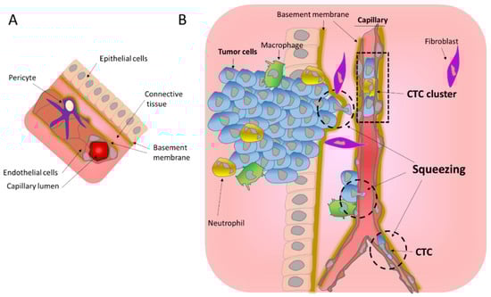 Blood vessels formed by endothelial cells organized into a tube and wrapped by pericyte cells (Figure 1A), can be very different in size ranging from 25 mm in diameter in the case of the aorta to as few as 5 to 10 μm in the case of the capillaries. As opposed to large blood vessels, capillaries are formed by a single layer of the endothelium allowing the exchange of nutrients mainly through diffusion. It is noteworthy that tumor blood vessels are morphologically different from normal blood vessels. They are characterized as tortuous and leaky, with abnormal basement membranes and with abnormal pericytes [14]. Pericytes on tumor capillaries are loosely associated with endothelial cells and exhibit an abnormal shape, sometimes extending their processes away from the endothelium and towards the tumor [15]. These tumor capillary abnormalities might facilitate the entrance of tumor cells into the blood stream.