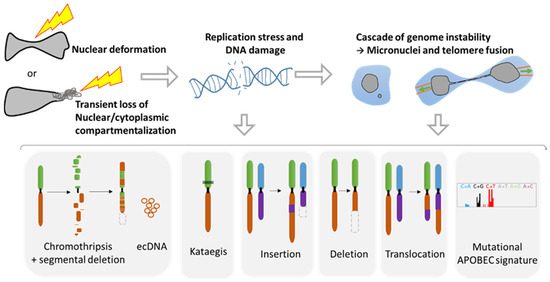 Genomic instability associated with nuclear squeezing and nuclear envelope rupture leads to the generation of genomic diversity. Nuclear deformation and nuclear envelope collapse, displaying a transient loss of compartmentalization, lead to replication stress and DNA damage. This DNA damage can initiate a cascade of genomic alterations in the next mitosis with the generation of micronuclei and telomere fusion, provoking a chromatin bridge. Such events are known to initiate a myriad of diverse genomic events such as chromothripsis, extra chromosomal DNA (ecDNA), the hypermutated pattern Kataegis, events of insertions, deletion, and translocation, as well as the mutational signature APOBEC (Adapted from Gauthier BR, et al. [27]).