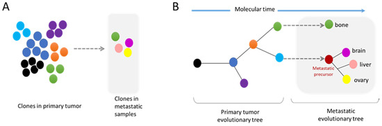 These analyses of whole genome data have also demonstrated that metastatic dissemination can be monoclonal or polyclonal. Furthermore, some metastatic clones can have their own subclone evolution through the increase in genome complexity of a metastatic precursor (Figure 4A,B) [67]. The comparative analyses of a metastatic tumor versus a primary tumor have indicated the absence of universal metastatic-specific driver alterations exclusive to metastatic disease. It rather shows a continuous evolution of the tumor with increased genome heterogeneity and complexity [68]. Nevertheless, recent data suggest that certain alterations, also found in primary tumors, are enriched at metastatic sites, revealing the possible existence of drivers specific to metastatic clones (Figure 4A) [68,69]. Moreover, distinct patterns of copy number alterations have been observed in metastases from different tumor types, highlighting that a specific gain/loss of chromosomes confers advantages in certain tumor types [66]. It is still unknown whether these specific drivers confer a better resistance to drugs and/or a better ability to succeed in the metastasis process. Interestingly, the analysis of specific metastatic tropism suggests that some genomic characteristics may be linked with the potential to seed in a specific organ. For example, a gain in semaphorin 4D was shown to support tumor cell transmigration through the blood–brain barrier and MYC has been suggested as a key factor for the adaptation of disseminated tumor cells to the activated brain microenvironment [70].