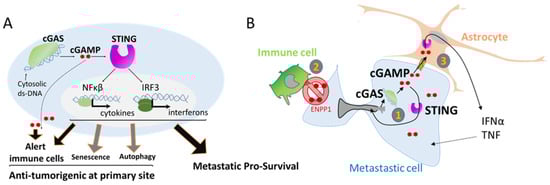 To conclude, cGAS/STING pathway activation can have opposite outcomes depending on its location. In primary tumor sites, the cGAS/STING pathway has an anti-tumorigenic action, being a major driver of cancer immunity, while at metastatic sites, this pathway has a pro-survival activity.