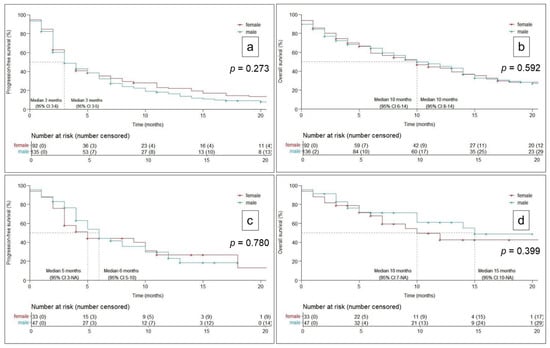 Kaplan–Meier analyses (Figure 1) showed no significant sex difference, neither in the ICI monotherapy cohort (PFS: men 3M (3–5), women 3M (3–6), p = 0.273; OS: men 10M (8–14), women 10M (6–14), p = 0.592), nor in the CHT-ICI cohort (PFS: men 6M (5–10), women 5M (3-/), p = 0.780; OS: men 15M (10-NA), OS women: 10M (7-NA), p = 0.399), respectively.