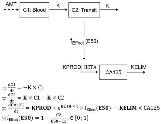 The semi-mechanistic model structure relies on a central compartment where the blood serum concentration of CA-125 is described through a production rate constant KPROD, balanced with an elimination rate constant KELIM. The KPROD is regulated by the effects of the chemotherapy, described with a 2-virtual-compartment model (C1 a central compartment receiving chemotherapy dosing and C2 a transit compartment) on the cancer cells through an indirect effect, characterized by an E50 inhibition rate constant. Because the concentrations of the chemotherapy were not available, a kinetic–pharmacodynamic (K-PD) model was developed to assess the longitudinal kinetics of CA-125 with the administration dose of chemotherapy arbitrarily set to 1, as already carried out for PK models [22].