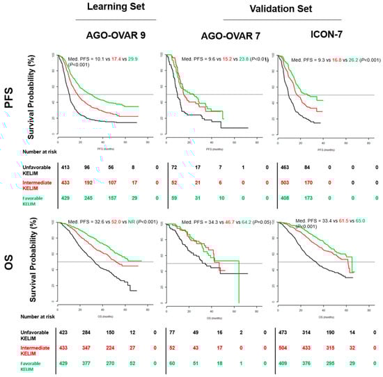 Kaplan–Meier analyses of PFS and OS in the learning set AGO OVAR 9 and the two validation sets AGO OVAR 7 and ICON-7. Black line, unfavorable KELIM tercile (minimum–0.05) days-1; red line, intermediate KELIM tercile (0.05−0.07) days−1; green line, favorable KELIM tercile (0.07–maximum) days−1; P: univariate log-rank tests; Med.: median. (Adjusted from Colomban et al., Clin Cancer Res 2019 [23]).