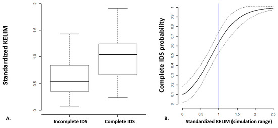 You et al. investigated the role of the chemosensitivity, assessed with KELIM, relative to the success of first-line medical–surgical treatment using data from the CHIVA trial [27]. Median std KELIM was significantly higher in patients who were operated with complete IDS (1.04) compared with patients operated with incomplete IDS (1.04 vs. 0.54, p < 0.01) (Figure 3a). In the final multivariate logistic regression model integrating (1) std KELIM as a continuous covariate; (2) FIGO stage; and (3) radiological response rate at the end of neoadjuvant chemotherapy, only std KELIM was found significantly associated with the likelihood of complete IDS (OR 16.13, 95% CI 5.51-53.38, p < 0.001). Based on std KELIM value, the probability of complete IDS can be estimated using a logistic regression curve (Figure 3b).