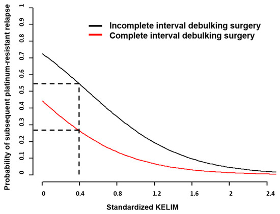 Platinum-Resistant Recurrence Score. Probability of subsequent platinum-resistant recurrence according to std KELIM. Dashed black line: illustration of a patient with std KELIM = 0.4; the risk of platinum-resistant relapse probability of 26% if IDS was complete or 54% if IDS was incomplete (Adjusted from You et al., Clin Cancer Res 2020 [27]).
