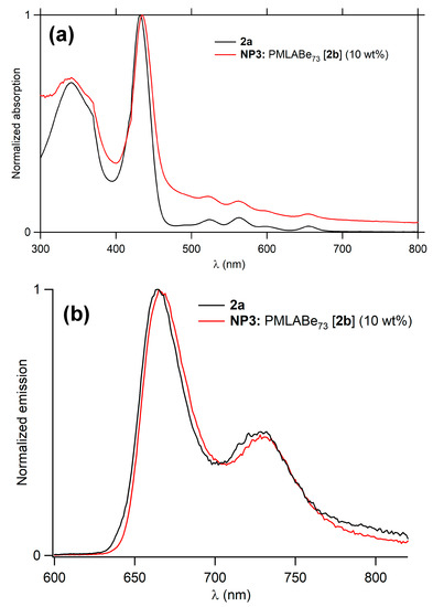 Comparison of UV-Vis spectra of 2a and of NP3 incorporating 10 wt% of 2b in water (a). Comparison of the emission spectra of 2a and of NP3 incorporating 10 wt% of 2b in water (b).