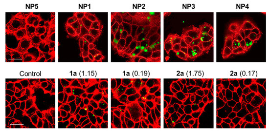 The NPs suspensions were vortexed just before testing in vitro. Living breast cancer cells (MCF-7) were incubated with NPs (25 µg·mL−1) for 20 h and two-photon excited fluorescence imaging (2PEF) was performed with a confocal microscope upon excitation at 790 nm with a Chameleon femtosecond laser. Cell membranes were stained with CellMask™ Orange (λex = 561 nm). The presence of porphyrin-loaded NPs within the cells is clearly established for NP1-4 (Figure 3, top), indicating that two-photon imaging is effective using NPs made from the PMLABe73 polymer. Notably, the empty NPs (NP5) are not fluorescent. To properly compare the imaging potential of these NPs loaded with butylated porphyrins with that of their water-soluble TEG-ylated analogues 1a and 2a, MCF-7 cells were also incubated with 1a and 2a at the very same concentrations as 1b and 2b embedded in NP1-4 (Table 5), and 2PEF was performed under the same conditions. At these concentrations, the TEG-ylated porphyrins (Figure 3, bottom) appear much less bright than the corresponding porphyrin-loaded NPs.