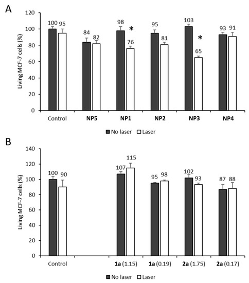 2P-PDT efficacy of NP1-5 (25 µg·mL−1) (A) and analogous TEG-ylated 1a and 2a at the same porphyrin concentrations (B) on MCF-7 cancer cells, upon irradiation with a Chameleon pulsed laser at 790 nm. Values are means ± standard deviations. *: p values < 0.05 (meaning that cell survival measured under irradiated conditions is significantly different from that obtained without irradiation).