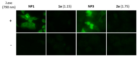 Two-photon photodynamic therapy (TP-PDT): Cells were seeded into 384-well glass bottom at 500 cells per well in 50 µL of culture medium and allowed to grow for 24 h. Then, cells were incubated for 20 h with the various NPs, 1a or 2a. After incubation, living cells were submitted or not to a irradiation with a pulsed laser, performed with a LSM 780 LIVE confocal microscope (Carl Zeiss, Le Pecq, France), at 790 nm (10×/0.3) with a focused laser beam and a maximum laser power (3 W input, 900 mW·cm−2 output before the objective). Half of the well was irradiated at 790 nm by 3 scans of 1.57 s duration in four different areas of the well. The scan size does not allow irradiating more areas without overlapping. After 2 days, a cell death quantification assay was performed by incubating cells with thiazolyl blue tetrazolium bromide (MTT) (0.5 mg·mL−1) for 4 h to determine the mitochondrial enzyme activity. Then, supernatant was removed, and 150 µL of EtOH/DMSO (1:1) was added to dissolve the MTT precipitates. Absorbance was measured at 540 nm with a microplate reader. Because only half of the wells were irradiated here, the value obtained was corrected according to the following formula: Abs “no laser”—2 × (Abs “no laser”—Abs “laser”).