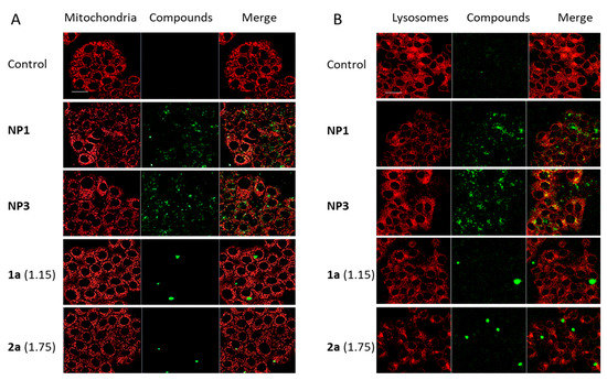 Colocalization experiments. MCF-7 breast cancer cells incubated for 20 h with NP1 and NP3 (25 µg·mL−1) and with analogous TEG-ylated 1a and 2a at the same porphyrin concentrations. NPs and free porphyrins were excited with a Chameleon femtosecond laser (λex = 790 nm) and appear here in green. Mitochondria (A) or lysosomes (B) were stained with MitoTracker (λex = 490 nm) or LysoTracker (λex = 577 nm), respectively and appear here in red. Scale bar: 10 µm.
