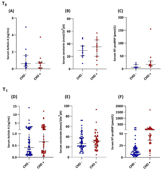 Serum Activin A (A), serotonin (B), and NT- pro BNP (C) levels in CHD+ patients and CHD- patients in the prediction (T0) and detection of CHD (T1) (D–F).