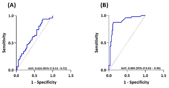 For detection of CHD, measurements at T1 were compared between CHD+ and CHD– patients. For CHD+ patients, T1 samples were collected a median of 2 (0–4) months after echocardiographic evidence of CHD. For CHD– patients, T1 samples were a median of 2 (range 0–9) months prior to echocardiographic confirmation of absence of CHD, but with a minimum of five years between first diagnosis of liver metastasis and the sample date. Serotonin levels were equally high in CHD+ patients (31.4 nmol/10E9plt (range 4.79–93.1)) and CHD– patients (26.7 nmol/109plt (range 7.73–71.9)) (p = 0.345) (Figure 2E). Median serum NT-proBNP levels were higher in CHD+ patients (63 pmol/L (range 4–1686)) compared to CHD– patients (11 pmol/L (range 1–213)) (p < 0.001) (Figure 2F). The AUC for NT-proBNP was 0.886 (95% CI 0.82–0.96) (Figure 3B). By using the current upper limit of normal (ULN) of NT-proBNP for the absence of cardiac conditions of 35 pmol/L [25,26], a sensitivity for detecting CHD of 77.1% and a specificity of 89.5% would be achieved. In our cohort, a cut-off of 27 pmol/L would provide the optimal threshold for CHD, with a sensitivity of 87.5% and a specificity of 87.7%. Median serum activin A levels between CHD+ (0.65 ng/mL (range 0.04–12.07)) and CHD+ patients (0.38 ng/mL (range 0.06–14.12)) (p = 0.0451) were significantly different (Figure 2D). The AUC for activin A was 0.616 (95% CI 0.51–0.72) (Figure 3A), and did not provide an optimal cut-off value for detection of CHD. Median serum sST2 (p = 0.694) and CTGF (p = 0.955) levels in CHD+ and CHD– patients were not significantly different (Supplementary Figure S1).