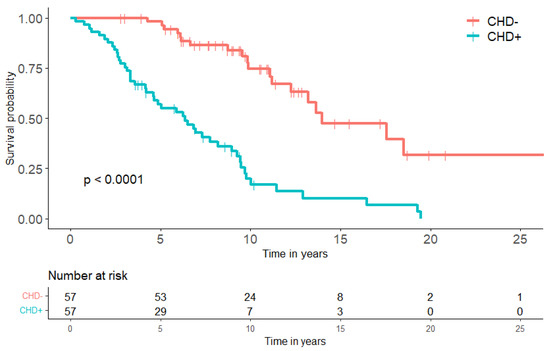 The median follow-up time for all 114 patients was 7.3 years (IQR 4.3–36.7). Twenty (35%) patients underwent valve replacement surgery. During follow up, 57 (50%) patients died of their NET, and another nine patients (8%) died of unknown causes. In the CHD+ group, 40 (70%) patients died of NET-related causes, and eight (14%) patients died of unknown causes. The cause of death in 11 (28%) CHD+ patients was directly attributable to CHD. Among CHD– known causes. The median DSS in CHD+ patients reached 6.4 years (CI 4.2–8.5); this was 13.7 years (CI 11.7-15.6) in CHD– patients (p < 0.001) (Figure 4). Similar results were found when including all consecutive patients with stage IV SI-NET as a control group. A total of 330 patients with stage IV SI-NET were included, with a medium DSS of 14.0 years (CI 8.0–20.0, p < 0.001).