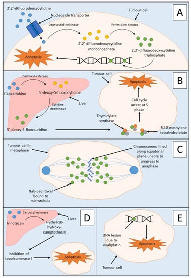 Mechanism of action of PDAC chemotherapies: (A) the mechanism of action of gemcitabine showing administration of prodrug 2′,2′-difluorodeoxycytidine, conversion to 2′,2′-difluorodeoxycytidine monophosphate, and 2′,2′-difluorodeoxycytidine triphosphate, respectively leading to incorporation into DNA and apoptosis of the tumour cell; (B) mechanism of action of capecitabine showing its metabolism to 5′-deoxy-5-fluorocytidine by carboxyl-esterase in the liver. This is further metabolised to 5′-deoxy-5′-fluorouridine by cytidine deaminase in both the liver and the tumour. 5′-deoxy-5′-fluorouridine inhibits thymidylate synthase by forming a ternary complex with thymidylate synthase and 5,10-methylenetetrahydrofolate. The formation of thymidine is stopped by the inhibition of thymidylate synthase, and therefore, DNA synthesis is blocked in S phase of the cell cycle’ (C) mechanism of action of nab-paclitaxel showing the binding of paclitaxel to the tubulin beta-subunit of the microtubules. This leads to the inability of the chromosomes to separate resulting in the inhibition of mitosis of the tumour cell and inevitably apoptosis; (D) mechanism of action of irinotecan through administration of the camptothecin-derivative prodrug. Carboxyl-esterase in the liver converts irinotecan to its active form, 7-ethyl-10-hydroxy-camptothecin, which causes impaired DNA synthesis via the inhibition of topoisomerase I preventing the removal of torsional stress. This then leads to a double-stranded DNA break, ultimately leading to cell death; (E) mechanism of action of oxaliplatin showing the induction of apoptosis of tumour cells due to DNA damage via DNA lesions which leads to the inhibition of both DNA and messenger RNA.