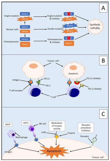 Mechanism of action of three PDAC immunotherapies: (A) the mechanism of synthetic lethality showing normal cells, single mutation, or overexpression of one gene is viable for a cell but inhibition of one gene and mutation in the other, a double mutation, or overexpression of one gene and inhibition of the other leads to cell death via cell viability; (B) mechanism of action of immune checkpoint inhibitors, for example, PD-1 and PD-L1. Binding of PD-1 and PD-L1 inhibits activation of T cells. Upregulation of both PD-1 and PD-L1 in tumour cells makes them an ideal target for inhibition leading to the activation of T cells; (C) mechanism of action of monoclonal antibodies (mAbs) in cancer treatment. mAbs may be used to target different molecules in the treatment of cancer, for example, receptors, antigens, or enzymes. Receptors on macrophages may target Fc portions of antigen-bound mAb and engulf tumour cells through antibody-dependent cellular phagocytosis (ADCP). Receptors on natural killer (NK) cells may also target Fc portions of antigen-bound mAb and imitate antibody-dependent cellular cytotoxicity (ADCC).