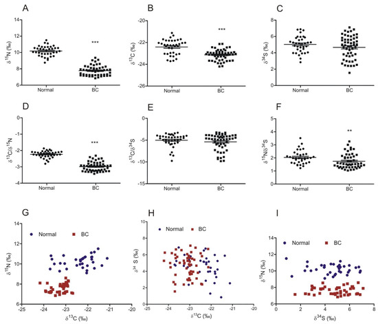The abundance of natural stable isotopes of nitrogen, carbon, and sulfur in normal urothelium and bladder cancer (BC). Level of δ15N (A), δ13C (B), and δ34S (C) and the ratio of δ13C/δ15N (D), δ13C/δ34S (E), and δ15N/δ34S (F) in urothelium and bladder cancer samples (mean ± SEM). (G–I) Scatter plots showing the relationship between the abundance of isotope pairs (δ13C–δ15N, δ13C–δ34S, and δ34S–δ15N, respectively) in each sample of normal urothelium and bladder cancer. ** p < 0.01; *** p < 0.001.