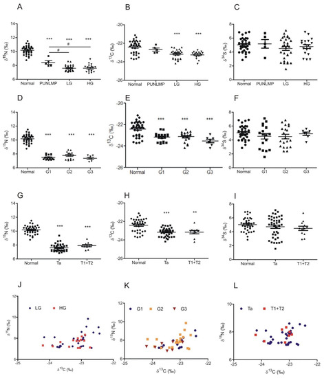 The abundance of 15N, 13C, and 34S isotopes in relation to bladder cancer grade according to the WHO 2004/2016 (A–C) and WHO 1973 (D–F) classification systems and TNM stage classification (G–I) (mean ± SEM). Scatter plots showing the abundance of isotope pairs (δ13C—δ15N, δ13C–δ34S, and δ34S–δ15N, respectively) in each sample of bladder cancer in relation to tumor grade and stage (J–L). ** (p < 0.01) and *** (p < 0.001) indicate significant differences when compared to normal tissue; # (p < 0.05) show significant differences between PUNLMP and low/high grade (LG/HG) bladder cancers.