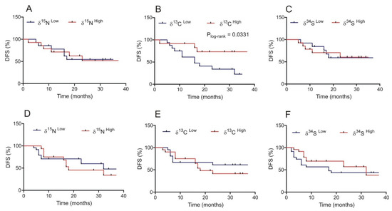 Disease-free survival (DFS) was assessed with the Kaplan–Meier method and compared using the long-rank test. A multivariate DFS analysis was performed for all of the variables that were significant in the univariate analysis using the Cox regression model. The disease-free survival curves were compared between two groups: low (≤median value) and high (>median value) δ15N, δ13C, and δ34S values.