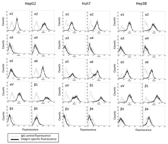 Integrin α and β expression profile on HepG2, Huh7, and Hep3B cells. Cell number (Counts) versus fluorescence intensity is depicted (one representative of three separate experiments). Black line = specific fluorescence, grey line = isotype control.
