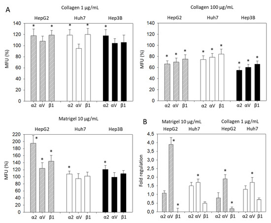 (A) Integrin α2, αV, and β1 expression level evaluated 72h after exposing HCC cells to collagen (1 µg/mL, 100 µg/mL) or Matrigel (10 µg/mL). All fluorescence values (MFU) are related to untreated controls set to 100%. Means ± SD of n = 4. * significant difference to the controls set to 100%; (B) Gene expression of integrin α2, αV, and β1, depicted as fold regulation relative to the control (control = 1). * indicates significant difference.