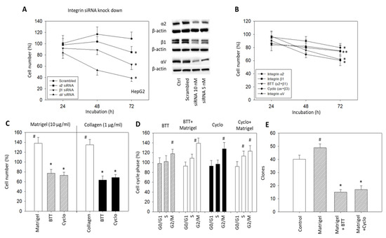 (A) HepG2 cell growth in response to α2, β1 or αV knockdown with small interfering RNA (siRNA) (Western blot at right); (B) HepG2 cell number in response to integrin blocking antibodies targeted against integrin α2, β1, αV, α2β1 (BTT), or αVβ3 (Cyclo). The respective MTT assay was completed after 24, 48, and 72 h. Cell number of non-blocked controls was set to 100%. * (A) indicates significant difference as marked. * (B) indicates significant difference to untreated controls (n = 3); (C) HepG2 cell growth in the presence of Matrigel (10 µg/mL) or collagen (1 µg/mL) and subsequent to Matrigel or collagen plus the blockade of integrin α2β1 with BTT or αV with Cyclo. Cell number was evaluated after 72 h by the MTT assay and related to untreated controls set to 100%. (n = 3); (D) Cell cycle analysis of HepG2 cells under integrin α2β1 (BTT) or αV (Cyclo) blockade, or under stimulation with Matrigel (10 µg/mL) and blockade with integrin α2β1 (BTT + Matrigel) or αV (Cyclo + Matrigel). Percentage of cells in the G0/G1-, S-, and G2/M-phase is indicated (all related to respective controls set to 100%) (n = 3); (E) Clonogenic growth in the presence of Matrigel (10 µg/mL), in the presence of Matrigel plus integrin α2β1 blockade (Matrigel + BTT) or in the presence of Matrigel plus integrin αV blockade (Matrigel + Cyclo). Control cells remained untreated. # significant up-regulation, * significant down-regulation to untreated controls (n = 4).