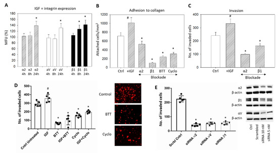 (A) IGF1 stimulated expression of the integrins α2, β1, and αV in HepG2 cells, evaluated after 4, 8, and 24 h. The figure depicts fluorescence intensity, related to untreated controls set to 100%. * significant difference (n = 3); (B) HepG2 cell adhesion to immobilized collagen after stimulation with IGF1 plus blockade with specific antibodies targeting α2 or β1, α2β1 (BTT) or αV (Cyclo). Controls remained untreated. Mean adhesion +/− SD is shown. # significant upregulation, * significant downregulation, compared to the untreated controls (n = 4); (C) Invasion of HepG2 cells after stimulation with IGF1 plus blockade with specific antibodies targeting α2 or β1. Cell number is related to untreated controls; (D) Invasion of HepG2 cells (mean +/− SD) after stimulation with IGF plus blockade by BTT (blockade against α2β1) and Cyclo (blockade against αVβ3). Controls remained untreated. # significant difference to the untreated control, * significant downregulation to the control (n = 3). Right panel represents stained invaded cells (x200 objective; control versus BTT or Cyclo treatment); (E) HepG2 cell invasion in response to α2, β1, or αV knockdown with small interfering RNA (siRNA) (Western blot at right).