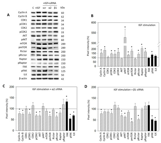 IGF1 activation of HepG2 resulted in a distinct modification of the CDK-Cyclin axis, in AKT/mTOR signaling, as well as in integrin-related proteins (Figure 7A,B, Supplementary Materials, Figure S1). Cyclin A and B, CDK2 and the phosphorylated form of CDK1 and 2 were upregulated. The mTOR, Raptor (both: total and phosphorylated) and pRictor were elevated as well. Notably, a massive increase in pAKT was seen. The pFAK, from the integrin-related signaling proteins, was significantly enhanced following IGF exposure (Figure 7A,B). The interconnection with integrin signaling was then investigated by knocking down integrins α2 and β1 in the HepG2 cell line (Figure 7A,C,D). Knocking down α2 was associated with a reduction in Cyclin A and B, pCDK1 and pCDK2, AKT, pmTOR, pRictor, and Raptor. FAK was elevated. However, pFAK and ILK were strongly diminished (Figure 7A,C). With the β1 knockdown, Cyclin A, pCDK1, Akt and, strongly, pAKT, pmTOR, and pRictor, were downregulated. Distinct loss in pFAK and ILK was also apparent (Figure 7A,D).