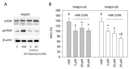 (A) mTOR and pmTOR protein expression. HepG2 cells were stimulated with IGF1 (IGF), remained untreated (C), or mTOR was blocked by the mTOR-inhibitor Rapamycin and then treated with IGF1. Protein analysis was accompanied by a β-actin loading control. One representative experiment of three is shown; (B) Surface expression of the integrin subtypes α2 and β1 on HepG2 cells. Tumor cells were either exposed to IGF1 (+IGF) or stimulated with IGF1 under AKT blockade with MK-2206. Detection was completed by FACS analysis. Mean fluorescence values (MFU) are related to untreated controls set to 100%. # indicates significant upregulation, compared to cells not exposed to IGF. * indicates significant downregulation to IGF stimulated cells. § indicates significant downregulation to cells not exposed to IGF1 (n = 3).
