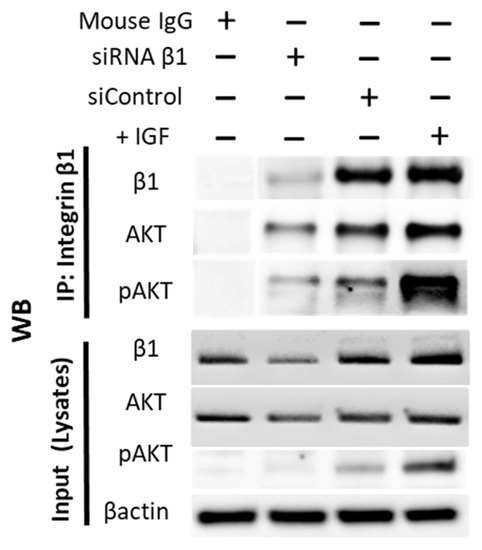 Interaction between integrins and Akt signaling is finally verified in Figure 9. Immunoprecipitation documented that both AKT (moderately) and pAKT (strongly) cross-communicate with the integrin subtype β1.