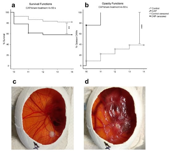 Kaplan–Meier curves of embryonal survival and CAM opacity after CAP treatment (n = 101) or sham treatment (n = 66). (a) The overall reduction of survival rate was highly significant (p = 0.001) after 4 × 60 s CAP treatment compared to sham treatment; (b) The rate of CAM opacity occurrence was significantly higher (p < 0.001) in CAP-treated eggs; (c) Representative images of an egg before CAP treatment on day 10 of incubation with clear CAM and a well-vascularized tumor (d) and past 4 × 60 s CAP treatment on day 14 of incubation with opaque and thickened CAM. ** p < 0.01, *** p < 0.001, in the log-rank test (Mantel–Cox).