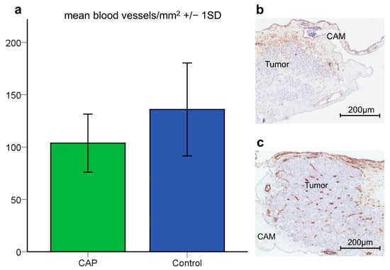 Tumor angiogenesis is a pivotal component tumor growth and nutritional supply [50]. Hence, the investigation of CAP-induced changes of tumor vasculature and the vascular network surrounding the tumor is of great importance. As displayed in Figure 2, tumors treated with CAP demonstrated a significantly lower mean vessel density compared to sham-treated tumors. These alterations seem to be attributed to direct effects like the coagulation of blood vessels [51,52,53] rather than to indirect effects such as reduced VEGF levels. The latter was indicated by a lack of significant differences in VEGF expression after CAP treatment (Figure 4) for. Contrary to these findings, reduced VEGF levels have been previously described in two malignant cell lines after CAP treatment [29,30].