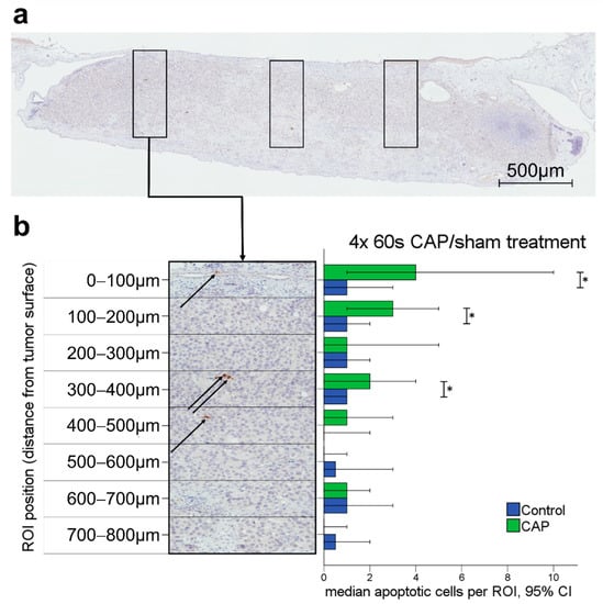 An increased apoptotic cell rate could mainly be observed in ROI located near the tumor surface (Figure 3b). More specifically, significantly higher rates of apoptotic cells in CAP-treated tumors were found up to a depth of 400 µm from the tumor surface, as displayed in Figure 3 (0–100 µm p = 0.012, 100–200 µm p = 0.048, 300–400 µm p = 0.027). The sample sizes of the analyzed ROI for each depth of tumor tissue are listed in Table S1. The depth dependency of CAP-associated effects was also confirmed using Kruskal–Wallis testing comparing apoptotic cell rates in depth-specific ROI within each treatment group (Supplementary Material S2).